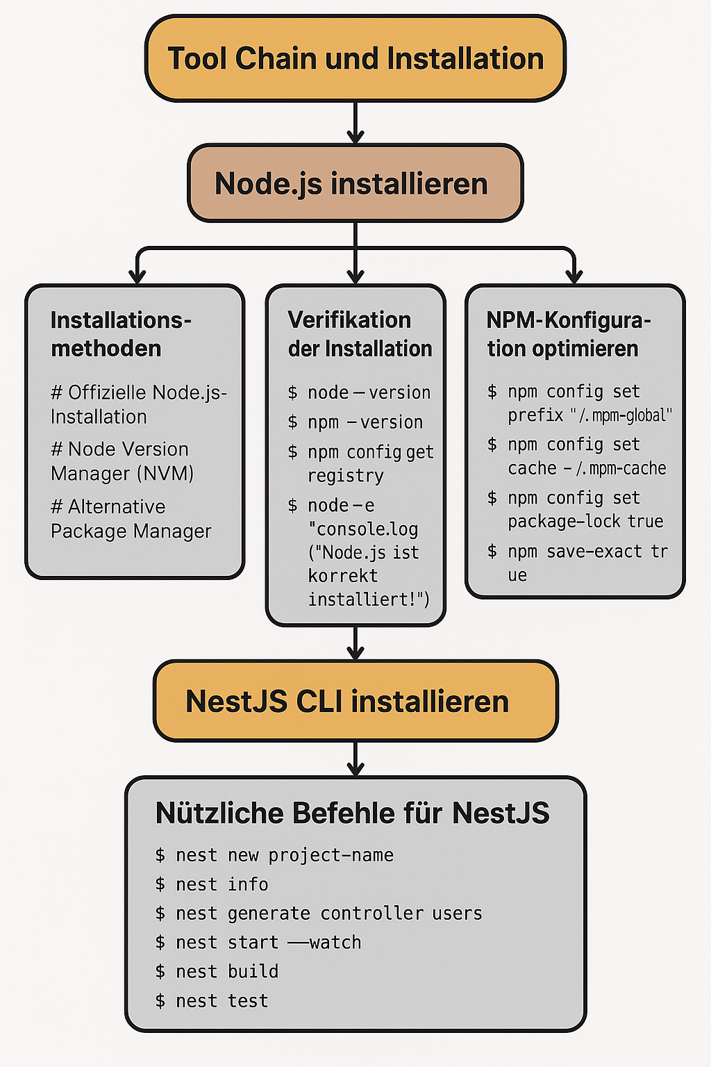 Die Einrichtung einer funktionsfähigen NestJS-Entwicklungsumgebung erfordert das Verständnis und die korrekte Installation verschiedener Tools und Abhängigkeiten. Dieses Kapitel führt Sie durch den kompletten Setup-Prozess und stellt Ihnen die wichtigsten Werkzeuge vor, die Sie für die professionelle NestJS-Entwicklung benötigen.
